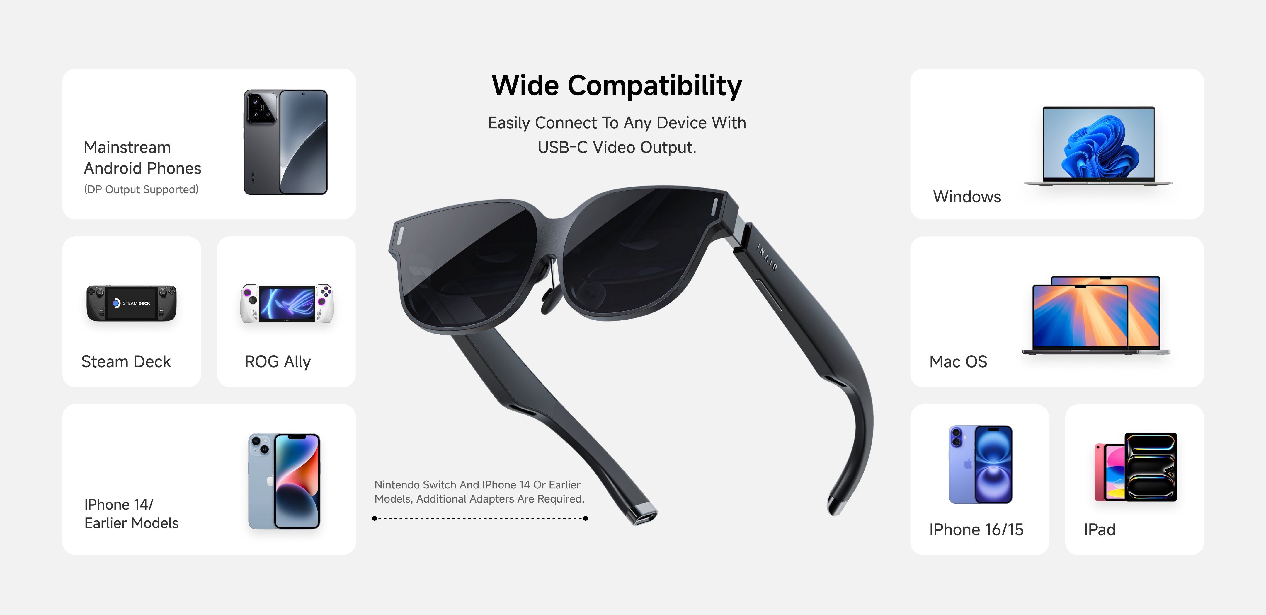 Tip: Our glasses require a device with Type-C video output. Since compatibility varies by brand and model, we can’t guarantee every device will work. To be sure, please check your device’s specifications on the official website or with the manufacturer’s support team.