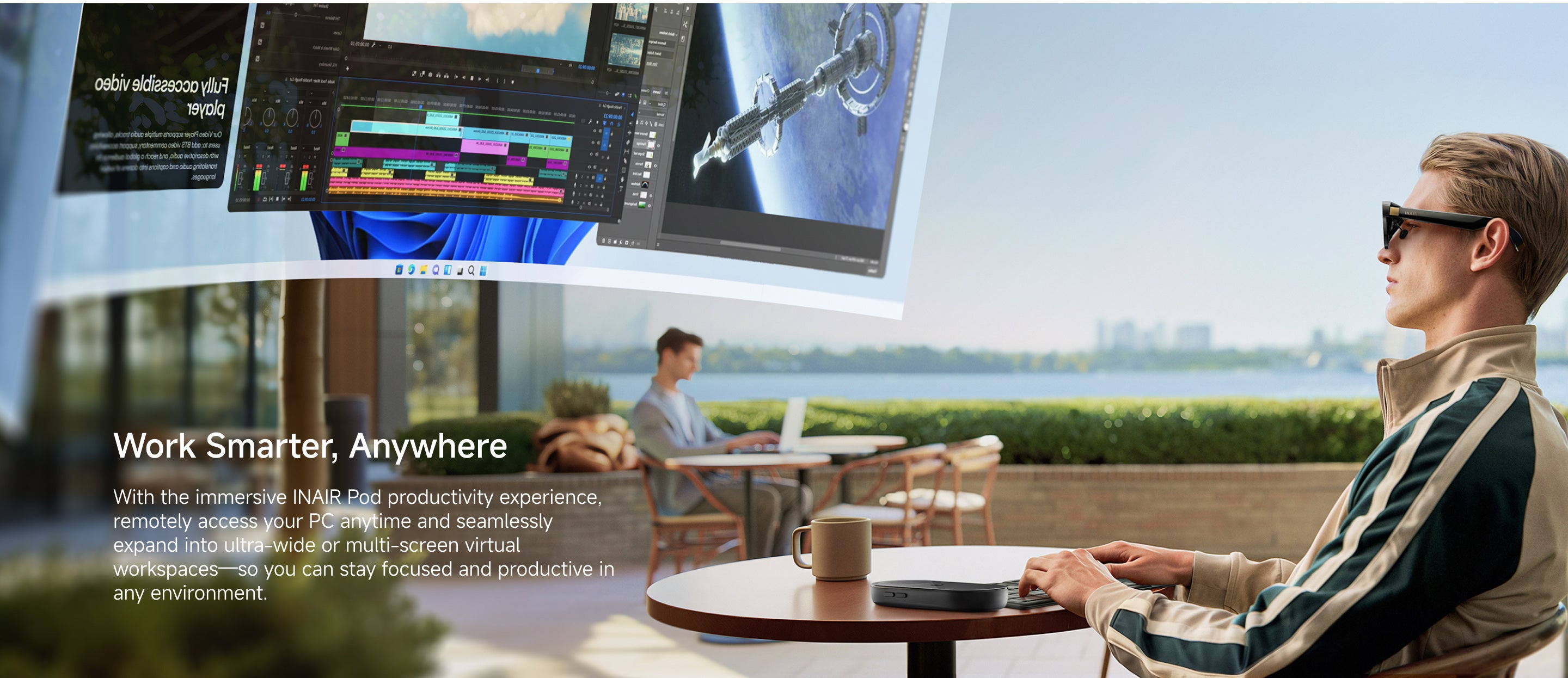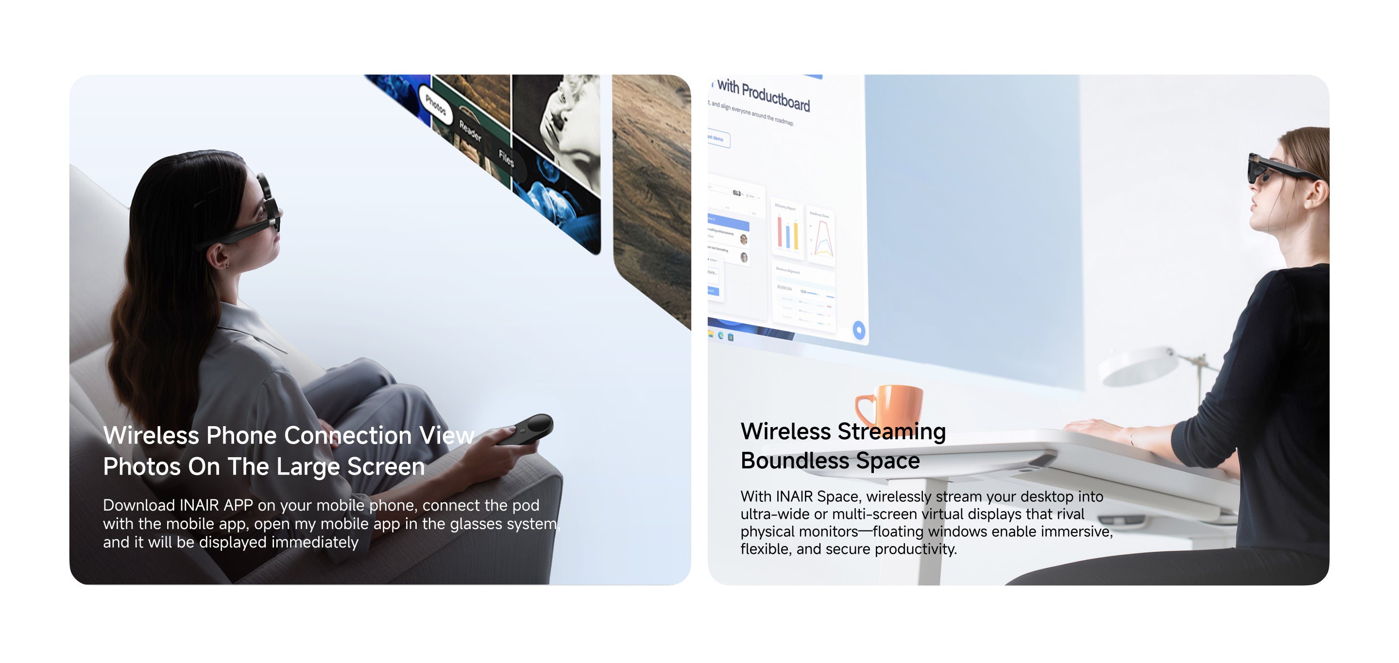 The INAIR 2 Pro Set includes the INAIR Pod, which runs on its own Android-based system. You can use it directly with the glasses — no phone or computer required — and it supports a wide range of Android apps for an all-in-one AR experience.